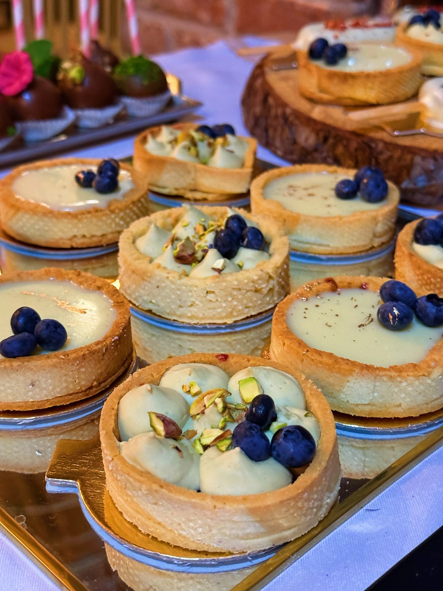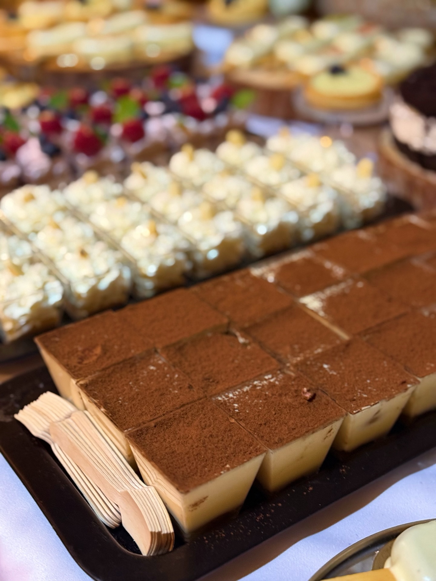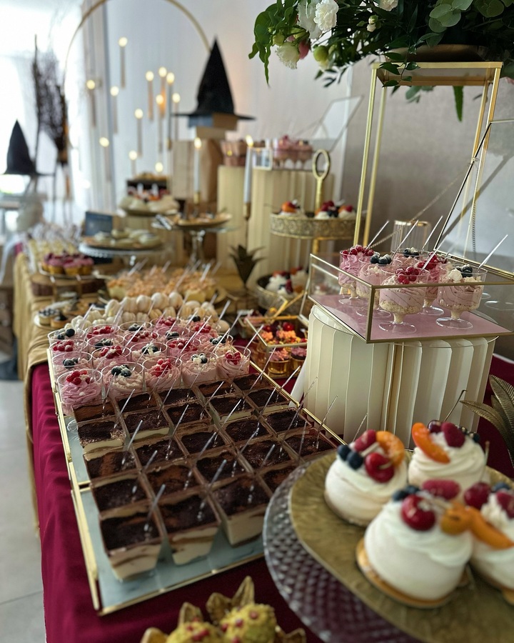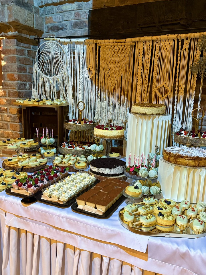 Na stołach pojawiają się wyłącznie desery przygotowane w mojej pracowni: eleganckie monoporcje, tiramisu, serniczki, musy, makaroniki, cake popsy oraz klasyczne ciasta w wersji premium.